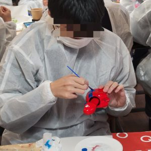 先に赤く色づけされた本体にアクリル絵の具で好きなように絵付けしていきます。